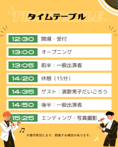 内容 各組1曲を披露し、思い出を語りながら感動を分かち合う市民参加型ステージイベント