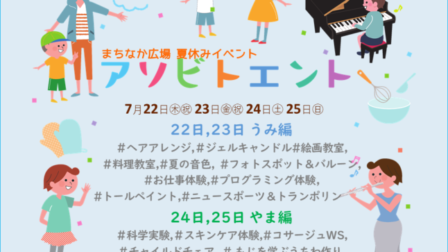 只今、空席があるプログラムに関しては先着で申し込みを受け付けております。 7月22日(木・祝)のイベント 7月23日(金・祝)のイベント 7月24日(土)のイベント 7月25日(日)のイベント … 続きを読む 【アソビトエント】まちなか広場夏休みイベント