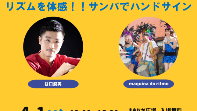 ハンドサインとは身振りを使った演奏指示をもとに即興で演奏する手法です。 手話を合図に参加者のみなさんがハンドクラップ(手拍子)等で音をつくり合い、 体全体で音楽を楽しむワークショップとなっております。 日程:4月1日(土 … 続きを読む リズムを体感!!サンバでハンドサイン