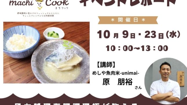 日本料理専門調理師が教えるワンランク上の晩ごはん 日時 2024年10月9日・23日(水) 時間 10:00~13:00 講師 めしや魚肉米-unimai- 大将 原朋裕さん/女将 原麻美さん 都城市上町にある「 … 続きを読む 【イベントレポート】④10月9日(水)・23日(水)日本料理専門調理師が教えるワンランク上の晩ごはん~めしや魚肉米~