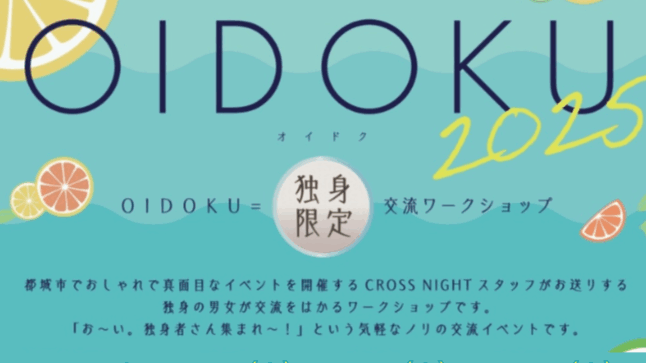 都城市でおしゃれで真面目なイベントを開催するCROSS NIGHTスタッフがお送りする 独身の男女が交流をはかるワークショップです。 「お~い。独身者さん集まれ~!」という気軽なノリの交流イベントです。 OIDOKUとは … 続きを読む 【2025年6月・7月】OIDOKU
