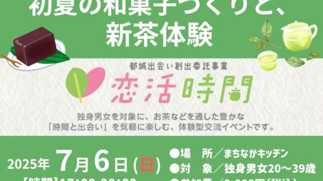 恋活時間【初夏の和菓子づくりと、新茶体験】を開催します! 「恋活時間」とは、独身者を対象にお茶などを通して 豊かな「時間と出会い」を気軽に楽しむ日本茶専門店 shop&café日向時間様主催のイベントです。 和菓子を … 続きを読む 【2025年7月】恋活時間「初夏の和菓子づくりと、新茶体験」