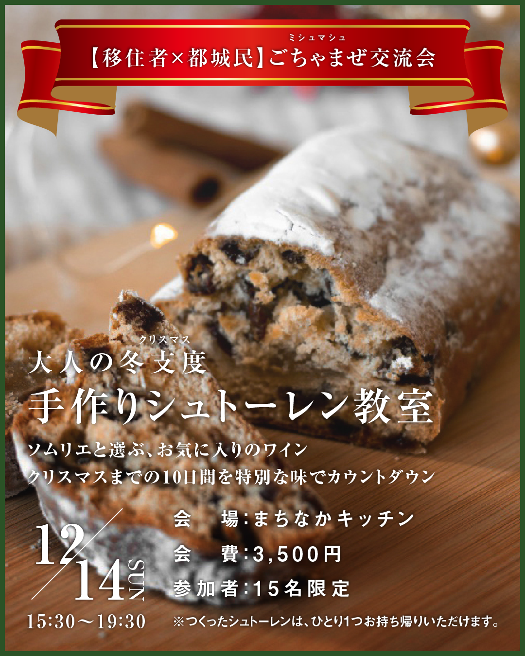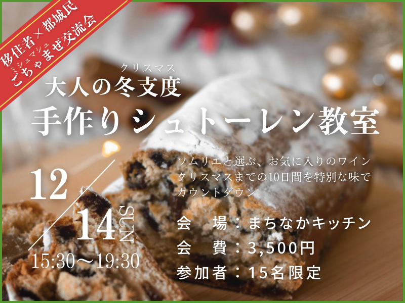 大人の冬支度(クリスマス) 手作りシュトーレン教室 移住者コミュニティ縁側engawa【2025年12月】 今回のイベントは、移住者と宮崎県民との交流イベントです。 |