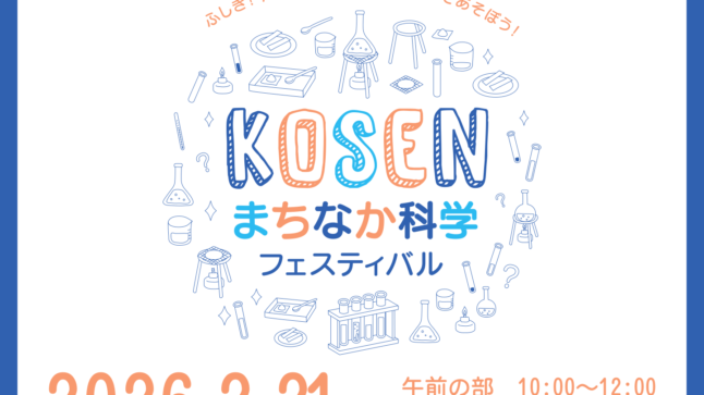◆KOSENまちなか科学フェスティバル◆ 都城高専のみなさんと一緒に、遊びながらふしぎに、楽しく、科学や工学にふれあえる様々なワークショップをお楽しみいただけます。 ■お申込みの際は、『代表者』の欄から参加 … 続きを読む 【2026年2月】KOSENまちなか科学フェスティバル