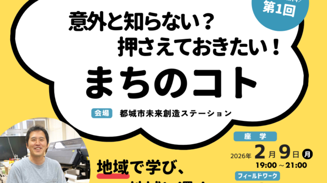 地域で学び、地域に還す。 まちづくりを通して「地域で学び、地域に還す」をテーマに、コトを起こしたい人のための探索、実践型の講座です。 座学とフィールドワークを通して、イキイキとした人とのつながりを楽しみに、次の一歩を一緒 … 続きを読む 【2026年】意外と知らない?押さえておきたい!まちのコト