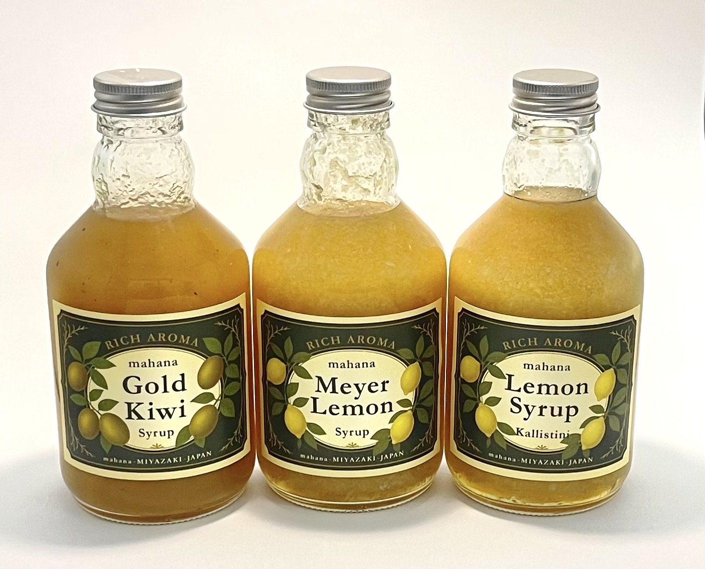 自社商品の宮崎県産未利用魚から作った『ひな天』、規格外品の日南産レモンと都農産ゴールドキウイ果汁からシロップをお販売しています。