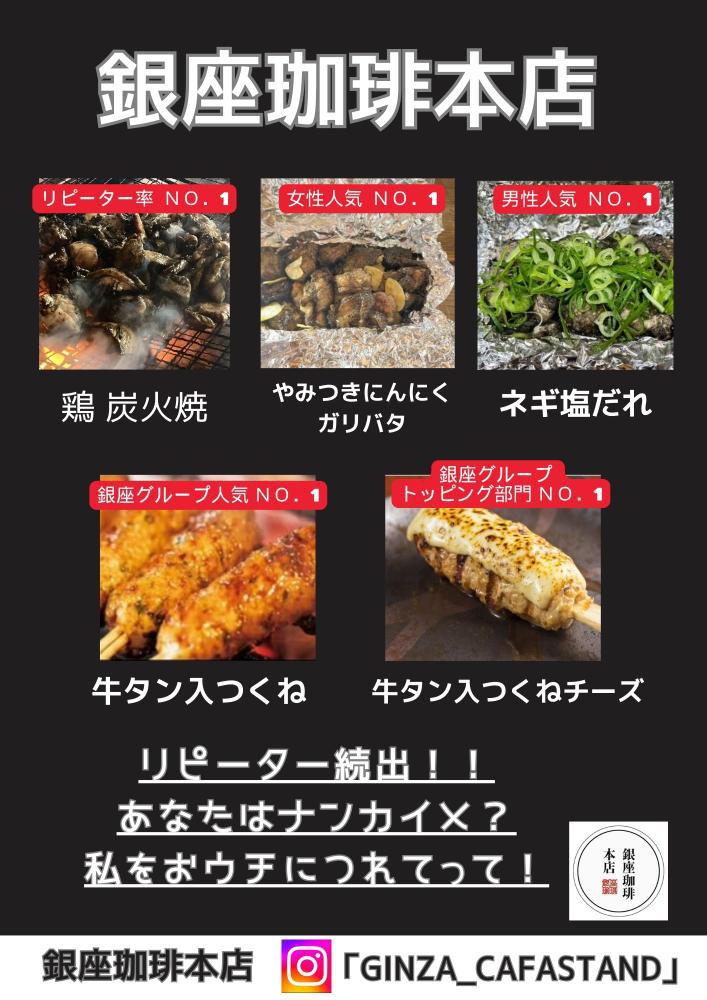 商品:鶏炭火焼、ガリバタ炭火焼、ネギ塩炭火焼、牛タン入つくね串、牛タン入つくね串炙りチーズ