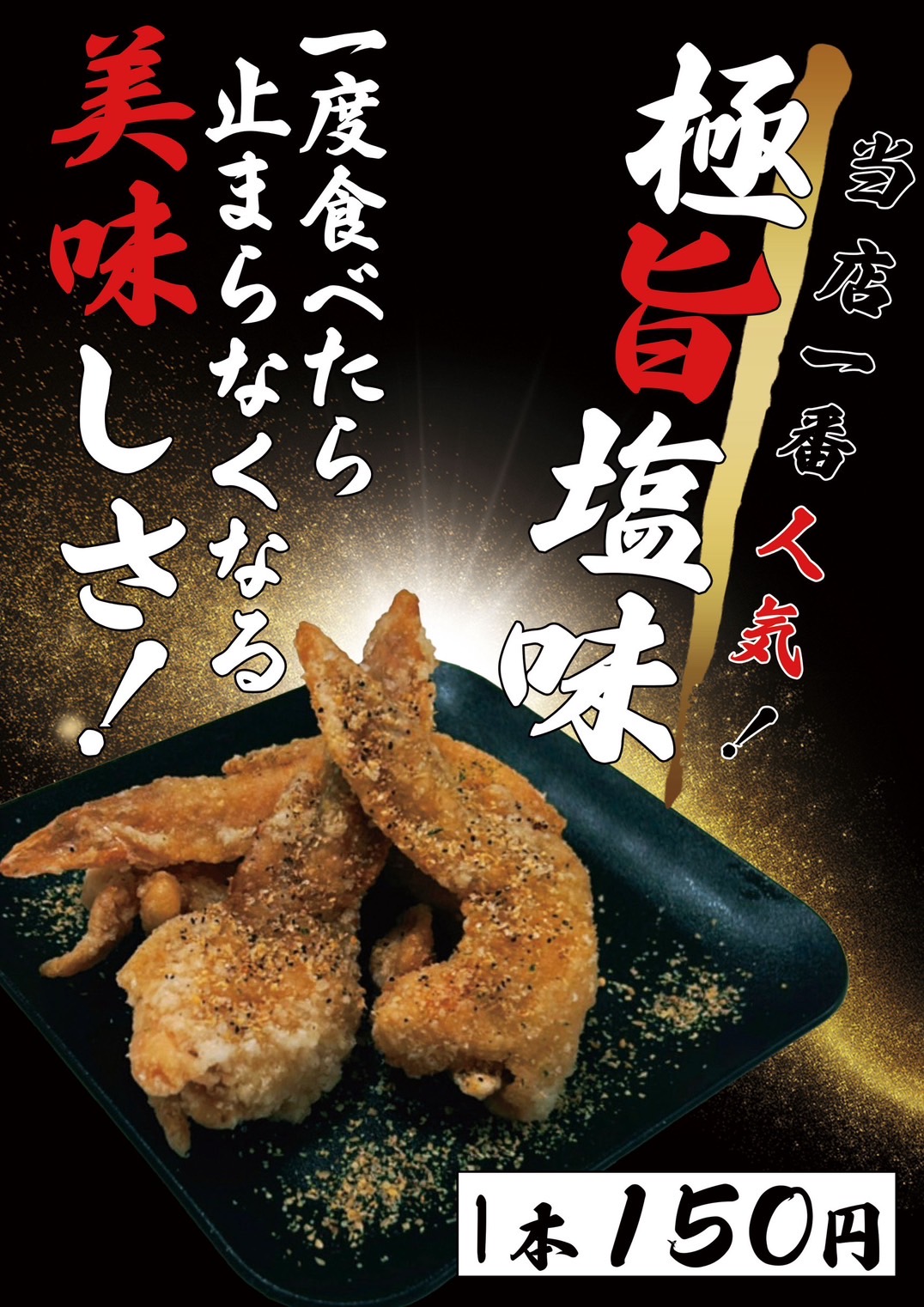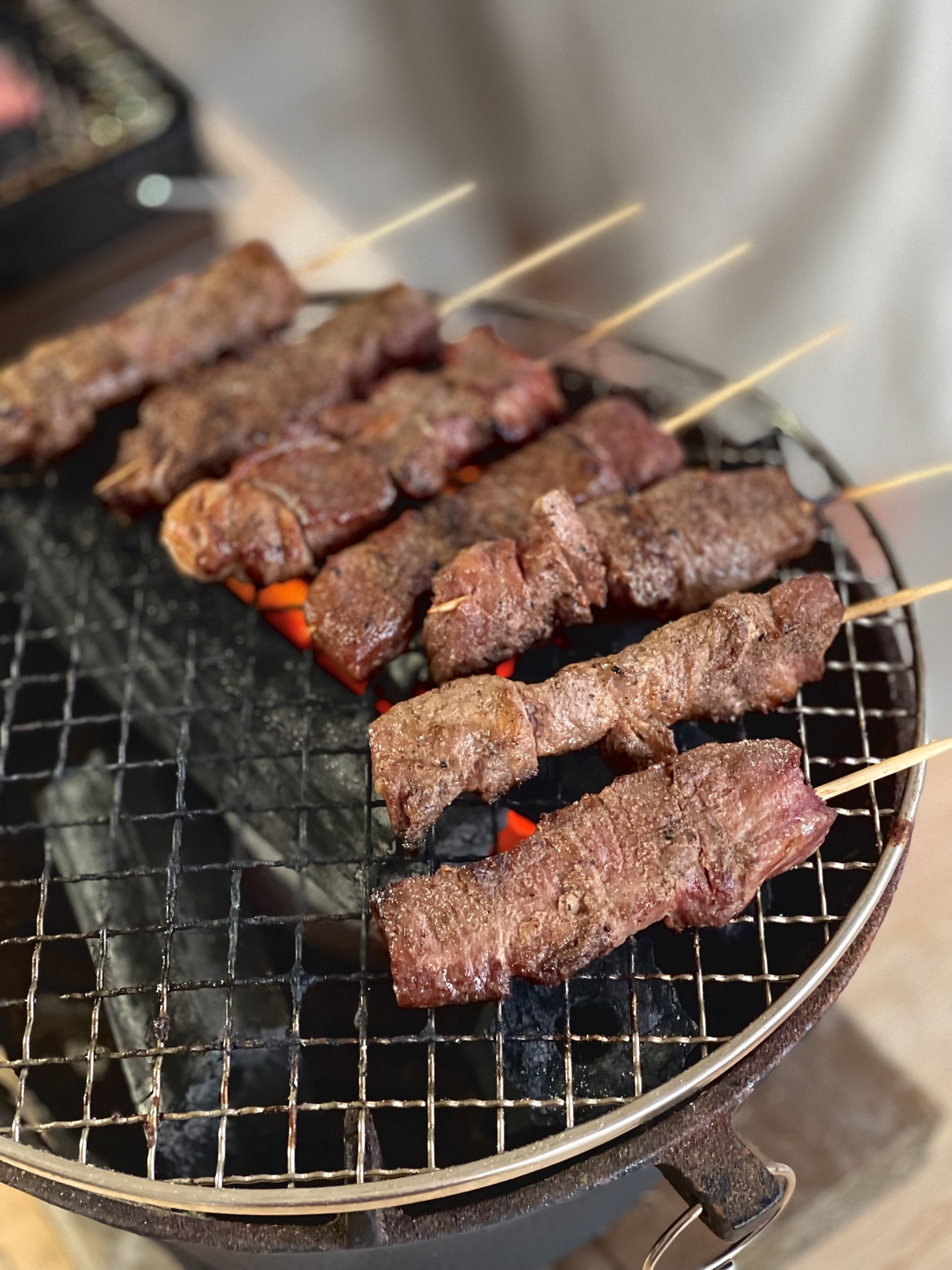 宮崎県産の鶏をオリジナルスパイスにて高火力で焼き上げた炭火焼、トッピングでガーリックバター/ネギ塩をご用意、また、牛タン入つくね串もおすすめです。是非ご賞味ください。