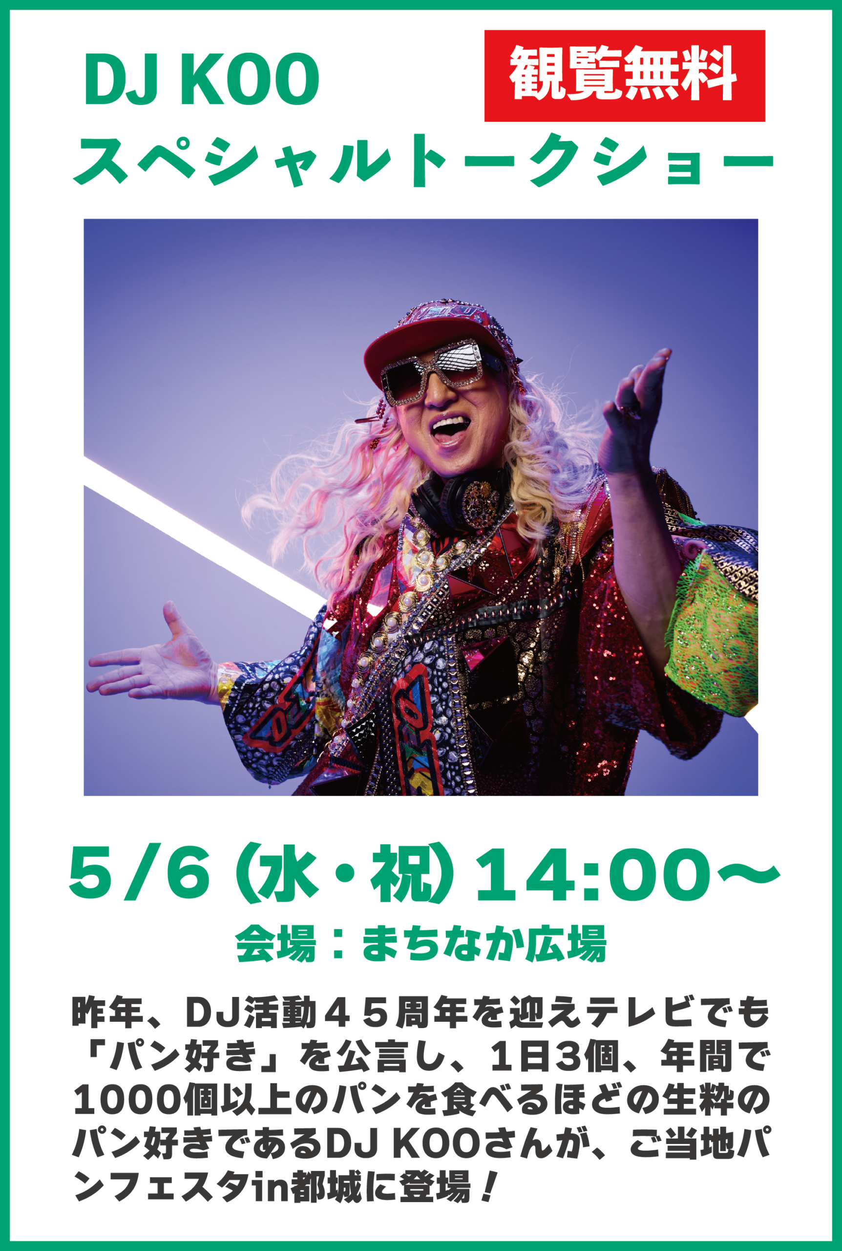 昨年、DJ活動45周年を迎えテレビでも「パン好き」を公言し、1日3個、年間で1000個以上のパンを食べるほどの生粋のパン好きであるDJ KOOさんが、ご当地パンフェスタ in 都城に登場!