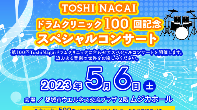 毎年開催しているToshi Nagaiドラムクリニックの100回目を記念したスペシャルコンサートを開催します。 500円でドラムクリニック見学、コンサートを両方お楽しみいただけます。迫力のある演奏をお届けします。 チケッ … 続きを読む 「ドラムクリニック100回記念 スペシャルコンサート」