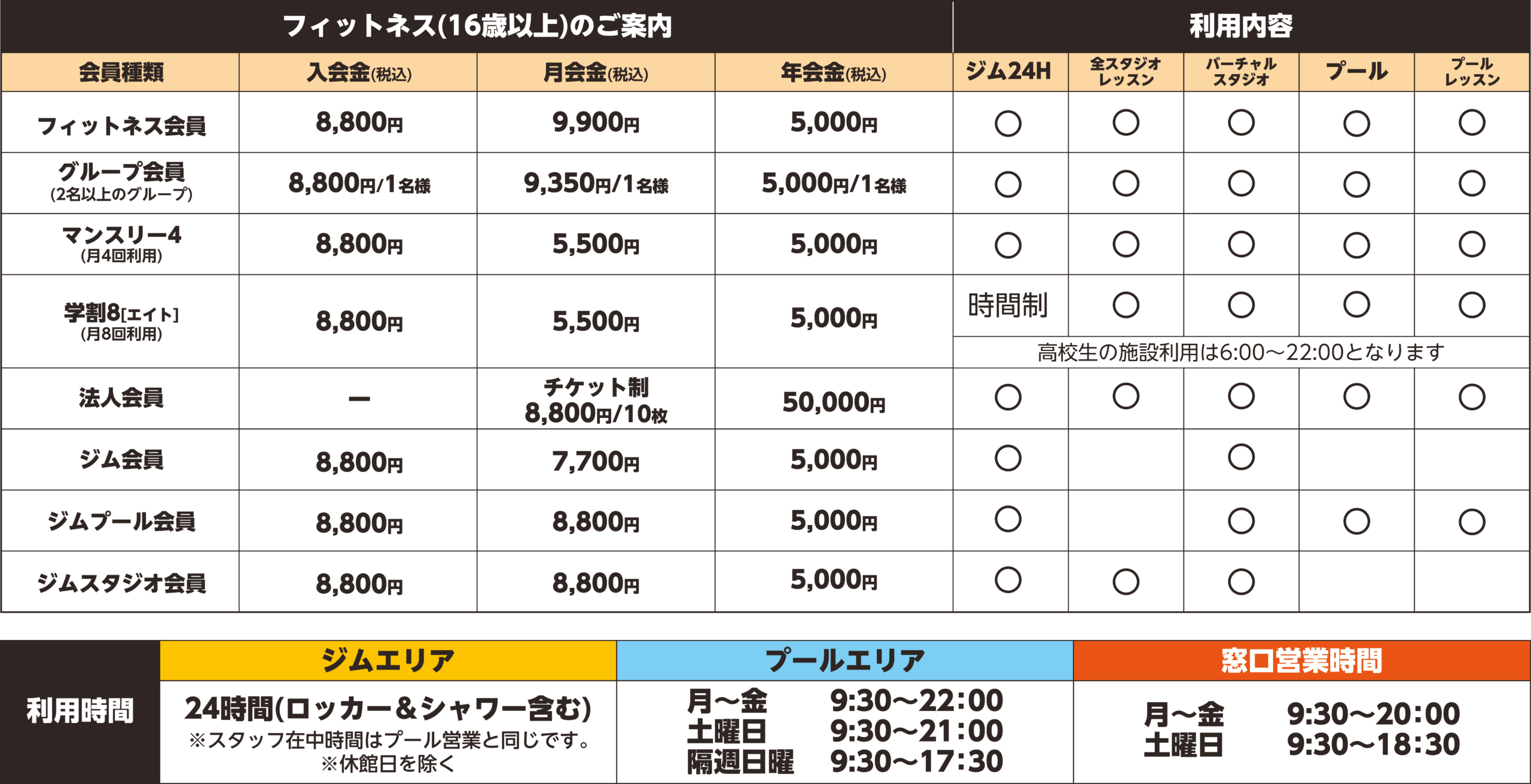 ※窓口&利用時間、レッスンスケジュールをご確認下さい