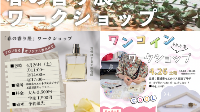 4月26日(土)にウエルネス交流プラザにて開始する【春の香り展】に合わせてワークショップを開催します。 予約不要のワンコインワークショップもありますのでぜひご参加ください。 調香体験ワークショップは満席になりました ※ワ … 続きを読む 春の香り展 ワークショップ