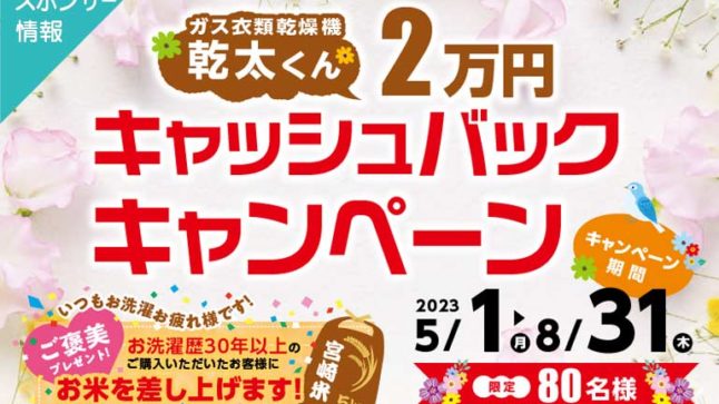 昨年、大変好評いただいた『ガス衣類乾燥機の2万円キャッシュバックキャンペーン』を今年も実施いたします! 花粉症・大気汚染の気になる方、洗濯物の多いご家庭、家事の時短にもピッタリ! SNSでも話題のガス衣類乾燥機「乾太くん … 続きを読む 【まちたんスポンサー情報】ガス衣類乾燥機乾太くん 2万円キャッシュバックキャンペーン<5月1日~8月31日>