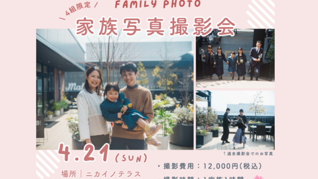 家族写真撮影会 開催! 4月21日(日)、ニカイノテラスにて「家族写真撮影会」を開催いたします。 この機会に家族の大切な瞬間を写真に残しませんか? 開催日時 4月21日(日) ①10:00~11:00 ②12: … 続きを読む 家族写真撮影会 ニカイノテラス