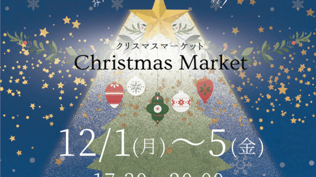 Mallmall まちなか広場で開催される平日マルシェのご案内です。 フード・雑貨・ワークショップ・リラクゼーションのお店が集まるマルシェでは、くつろげる空間、ゆったりと過ごせる時間をテーマにしています。 毎月開催してい … 続きを読む Christmas Market 1st week【12/1(月)~5(金)】