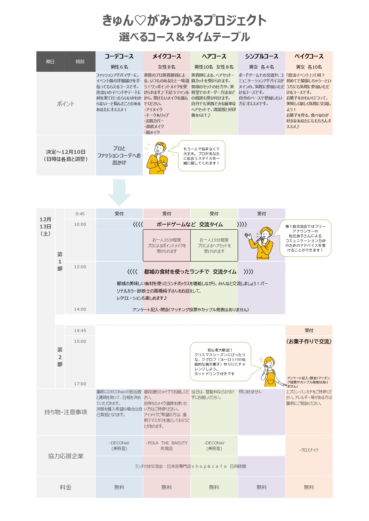 事前予約制&参加費無料で、楽しみながら見た目も内面も魅力アップできて、あなたにきゅん♡出会いにきゅん♡がみつかるイベントです。