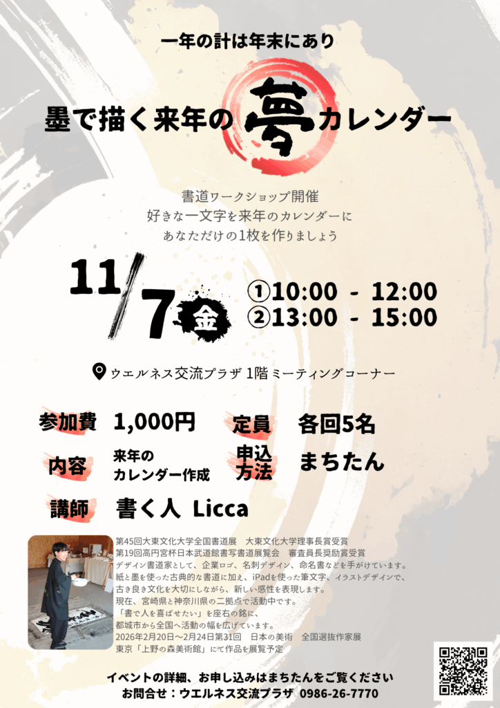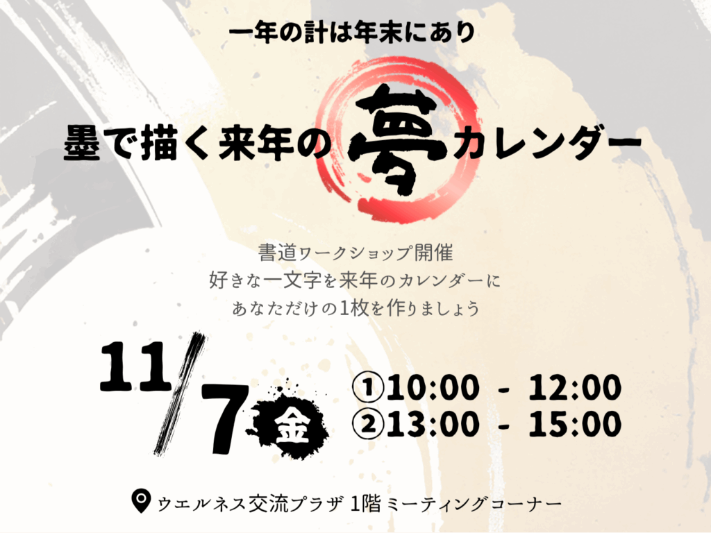 デザイン書道ワークショップ 【2025年11月】「 一年の計は年末にあり!」墨で描く来年の夢カレンダー 講師:書く人 Licca |