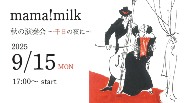 mama!milk 秋の演奏会 ~千日の夜に~ 赤い蛇腹のアコーディオンと、黒いアルコのコントラバスによるデュオ。 世界各地の文化との出会いから紡がれるワルツや楽曲は、「旅へいざなう音楽」とも評されています。 この秋、千 … 続きを読む mama!milk 秋の演奏会~千日の夜に~