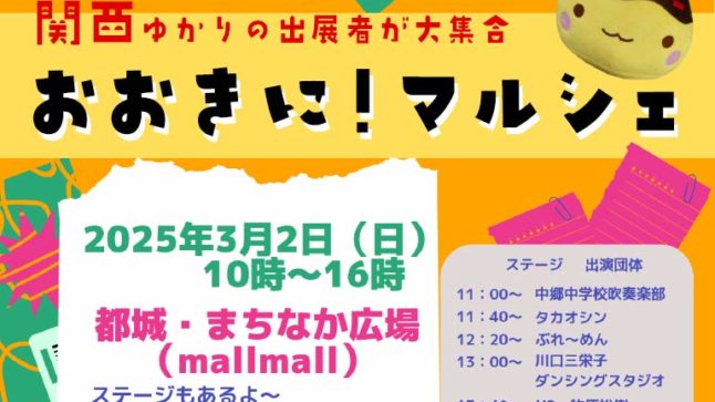 まちなか広場に関西ゆかりの出店者が大集合 キッチンカーやテント物販がいろいろ関西色たっぷり!? ステージでのダンスや吹奏楽ありますよ! ステージ タイムテーブル 11:00~ 中郷中学校吹奏楽部 ※出演者都合によりキャ … 続きを読む おおきに! マルシェ