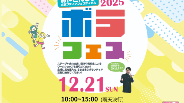 出会おう!えがお・やさしさ・あたらしい自分! 今年も、ボラフェスが開催されます! 地域団体によるフード出店や防災コーナー、学生によるワークショップなどボランティア活動であたらしい自分に出会えるような企画 … 続きを読む 【2025年12月】みやこんじょボランティアフェスティバル2025