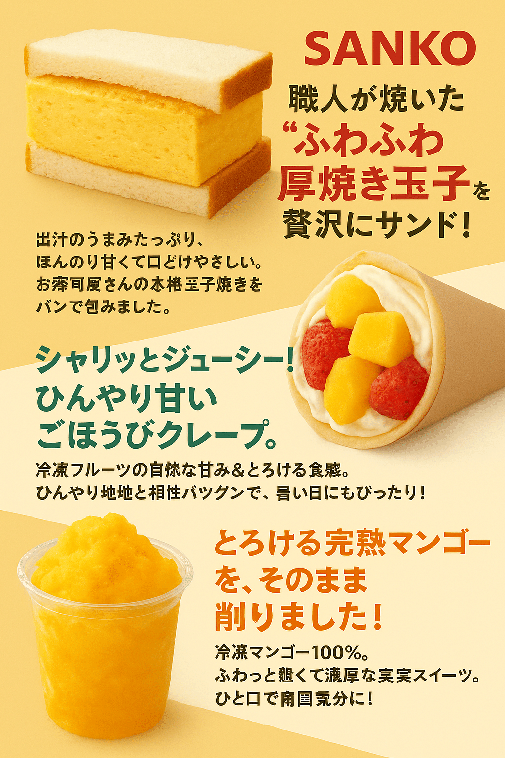 <厚焼き玉子サンド、クレープ、ソフトクリーム、削りマンゴー>