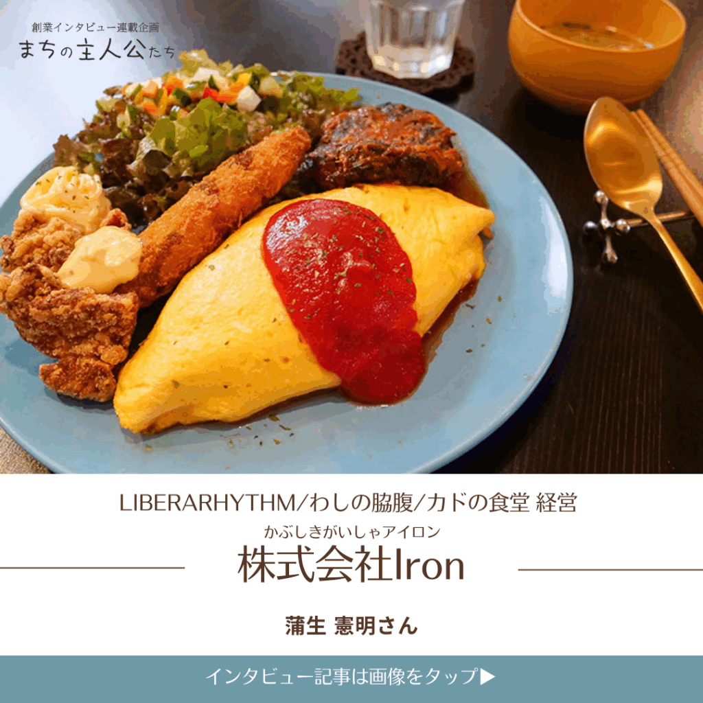 「株式会社Iron」蒲生 憲明さん「楽しい」が経営の核。創業15年を迎える経営者が語る、苦難を乗り越える哲学と次なる挑戦 都城市内に3店舗の飲食店を経営し、(「CAFE&DINING LIBERARHYTHM」「わしの脇腹(カレーうどん専門店)」「カドの食堂」)商品開発事業も展開する蒲生さんにこれまでの人生や経営哲学、そしてこれから起業を目指す人々へのメッセージを伺いました。 |