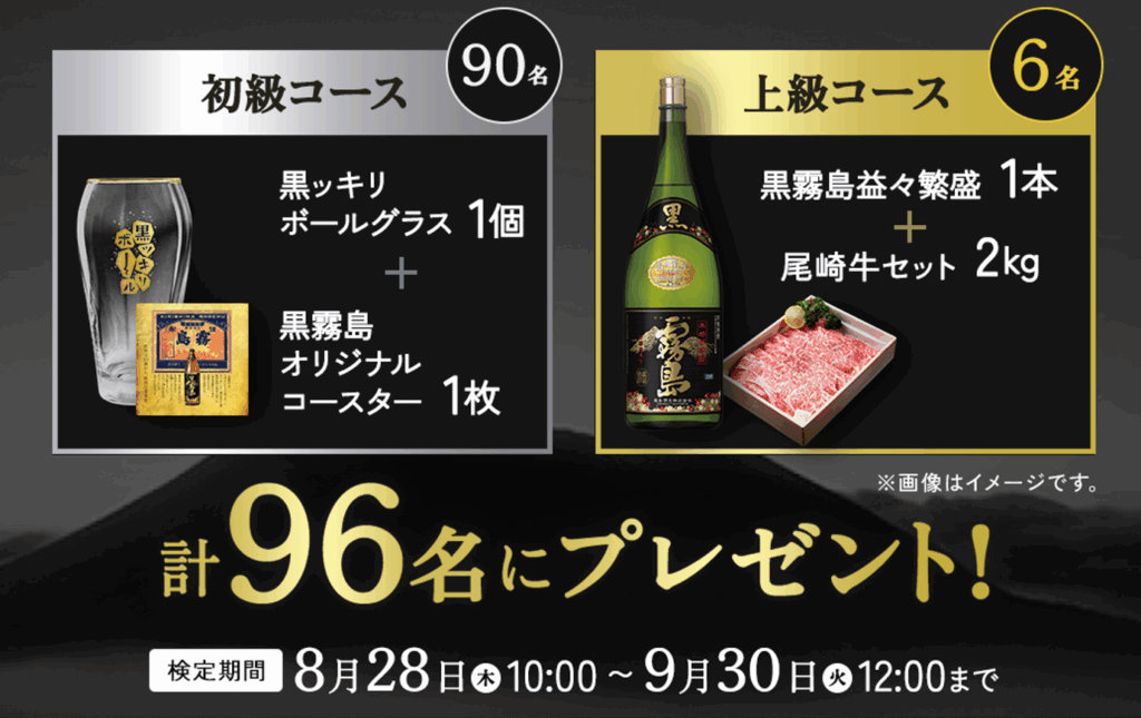 合格した方のなかから抽選で総計“96”名様に、豪華賞品をプレゼントします。初級コースでは、家飲みにぴったりの「黒ッキリボールグラス1個+黒霧島オリジナルコースター1枚」を90名様、上級コースでは、大容量の黒霧島と宮崎県を代表するブランド牛をセットにした「黒霧島益々繁盛※(4.5L/25度)1本+尾崎牛セット2kg」を6名様にプレゼント。