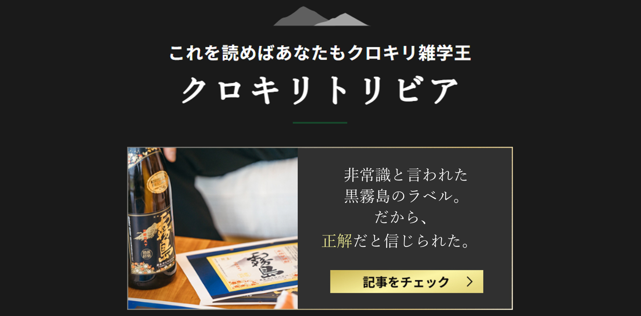 「黒霧島の日」を通じて、より多くの皆様が「黒霧島」について知って、好きになっていただけるよう、特設サイトを8月18日(月)から開設しています。サイト内では、新登場の黒霧島グッズが入った、黒霧島の日記念セットを販売しているほか、クロキリトリビアと題した黒霧島の秘蔵エピソードの紹介など、黒霧島の日を満喫できるコンテンツが盛りだくさんです。