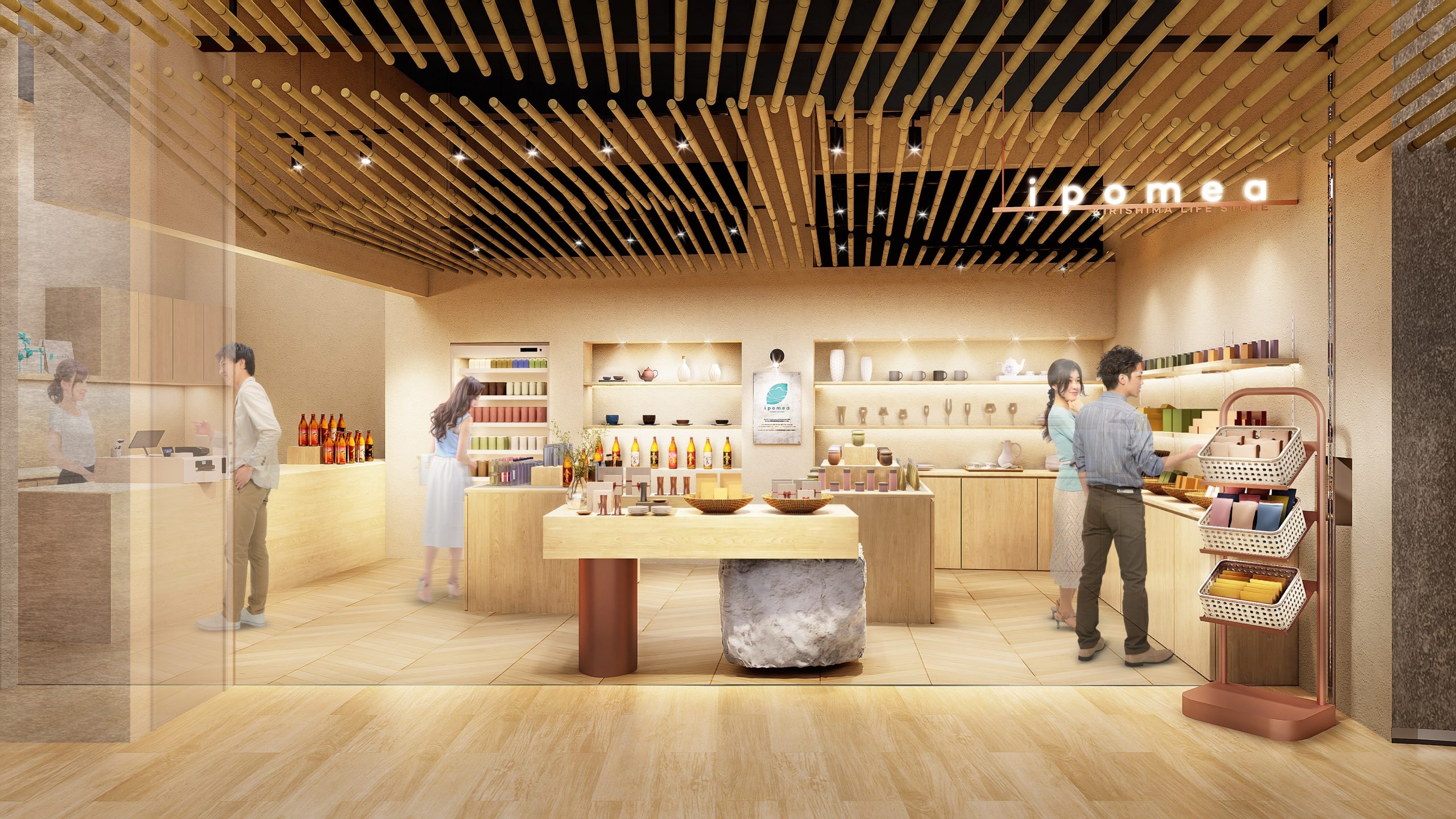 また、同施設内に開業する直営店舗は「KIRISHIMA LIFE STORE ipomea (キリシマ ライフ ストア イポメア)」とし、「霧島酒造が提案する暮らしをアップデートしてくれるアイテムが集まる場所」として、食品や酒器、雑貨などを中心に販売します。