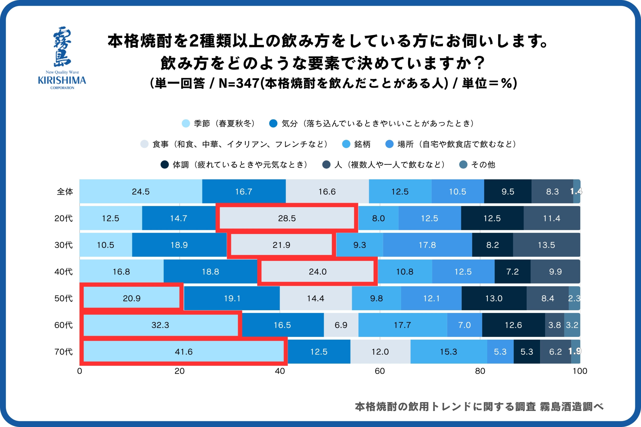その結果、20~40代では「食事」、50~70代では「季節」という回答がそれぞれ最多となりました。40代以下では、多様化した現代の食事とともに焼酎をよりカジュアルに飲むスタイルが広がっており、ワインなどの他アルコールと同様に料理との組み合わせを楽しんでいることがうかがえます。一方、50代以上では、季節に合わせて飲み方を使い分けている様子が見られ、長年の経験を通じて、暮らしに寄り添う焼酎文化が根づいていることがうかがえます。