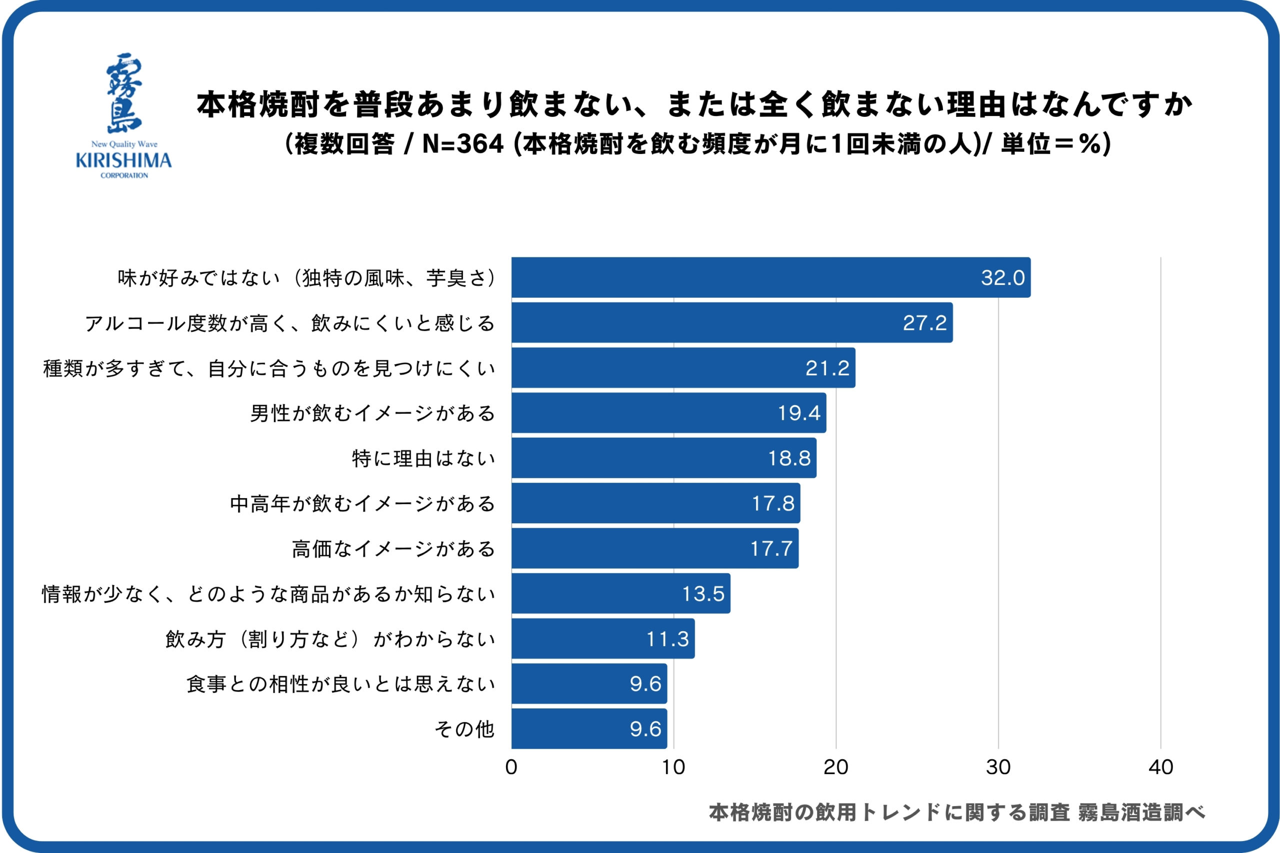 本格焼酎を飲む頻度が月に1回未満の方に本格焼酎を飲まない理由を質問したところ、1位「味が好みではない(独特の風味、芋臭さ)」(32.0%)、2位「アルコール度数が高く、飲みにくいと感じる」(27.2%)、3位「種類が多すぎて、自分に合うものを見つけにくい」(21.2%)という結果になりました。