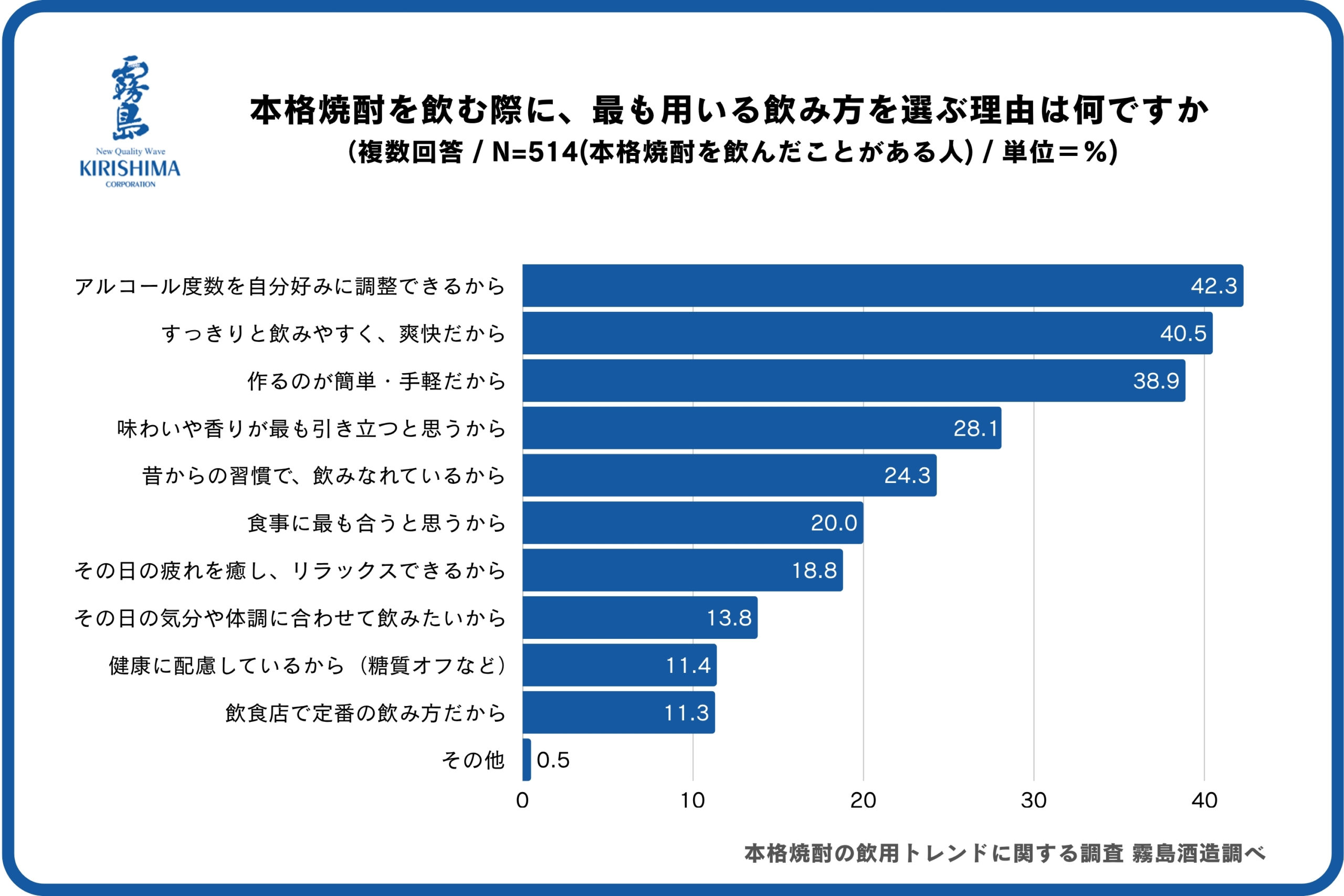 また、本格焼酎は様々な飲み方で楽しめるという特徴があります。その中でも最も用いる飲み方を選ぶ理由を質問したところ、1位は「アルコール度数を自分好みに調整できるから」(42.3%)、3位は「作るのが簡単・手軽だから」(38.9%)が選ばれ、価値観の多様化の進行にともなって高まっている一人ひとりの好みに合わせる『パーソナライズ化』や手間をかけずにアレンジをしたいニーズが見られる結果となりました。